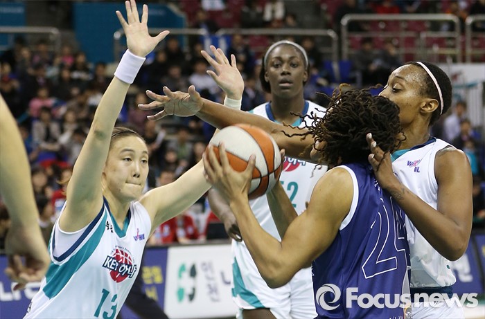 (부천=포커스뉴스) 8일 부천체육관에서 열린 2015-2016 여자프로농구 KEB하나은행-신한은행 경기에서 KEB하나은행 휴스턴과 김정은이 신한은행 모니크 커리를 에워싸며 막고 있다.