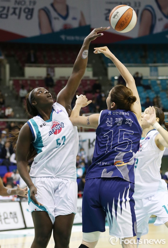 (부천=포커스뉴스) 8일 부천체육관에서 열린 2015-2016 여자프로농구 KEB하나은행-신한은행 경기에서 신한은행 신정자의 훅슛을 KEB하나은행 첼시 리가 쳐내고 있다.