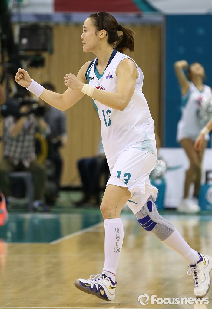 (부천=포커스뉴스) 8일 부천체육관에서 열린 2015-2016 여자프로농구 KEB하나은행-신한은행 경기에서 KEB하나은행 김정은이 2쿼터 막판에 3점슛을 성공시키고 두 주먹을 불끈 쥐고 있다.