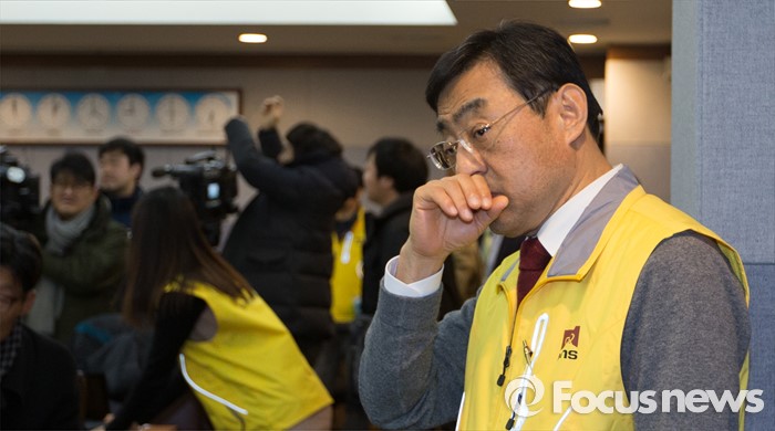 (대전=포커스뉴스) 8일 저녁 대전 유성구 한국원자력안전기술원 중회의실에서 김무환 한국원자력안전기술원장이 북한 핵실험 이후 반사성핵종 탐지·분석 결과 브리핑을 하기 위해 이동하고 있다.