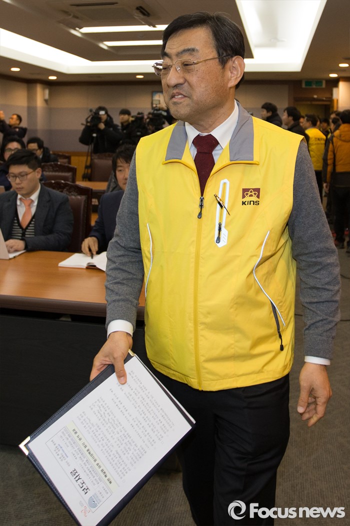 (대전=포커스뉴스) 8일 저녁 대전 유성구 한국원자력안전기술원 중회의실에서 김무환 한국원자력안전기술원장이 북한 핵실험 이후 반사성핵종 탐지·분석 결과 브리핑을 하기 위해 이동하고 있다.