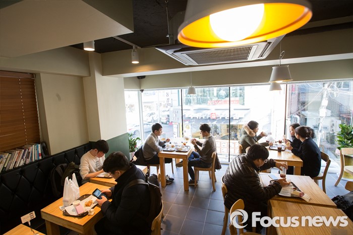 (서울=포커스뉴스)8일 오전 서울 성북구 '영철버거'에서 햄버거를 먹으러 온 손님들이 자리를 가득 메우고 있다. 고려대 앞 명물로 꼽히는 '영철버거'가 최근 경영난으로 문을 닫았다가, 고려대를 다녔던 학생들이 영철버거와의 추억을 잊지 못해 십시일반 도와 가게를 옮겨 재오픈 했다.