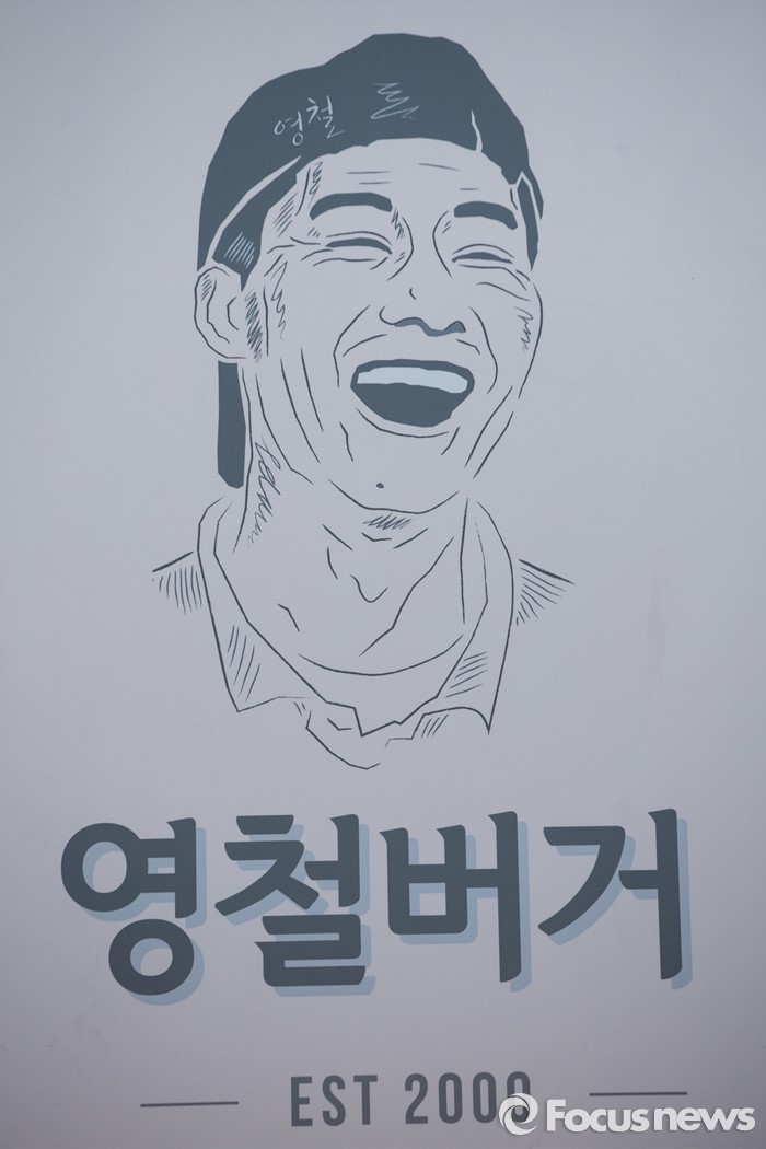 (서울=포커스뉴스)8일 오전 서울 성북구 '영철버거' 입구에 붙어 있는 영철버거 상호와 그림. 고려대 앞 명물로 꼽히는 '영철버거'가 최근 경영난으로 문을 닫았다가, 고려대를 다녔던 학생들이 영철버거와의 추억을 잊지 못해 십시일반 도와 가게를 옮겨 재오픈 했다.