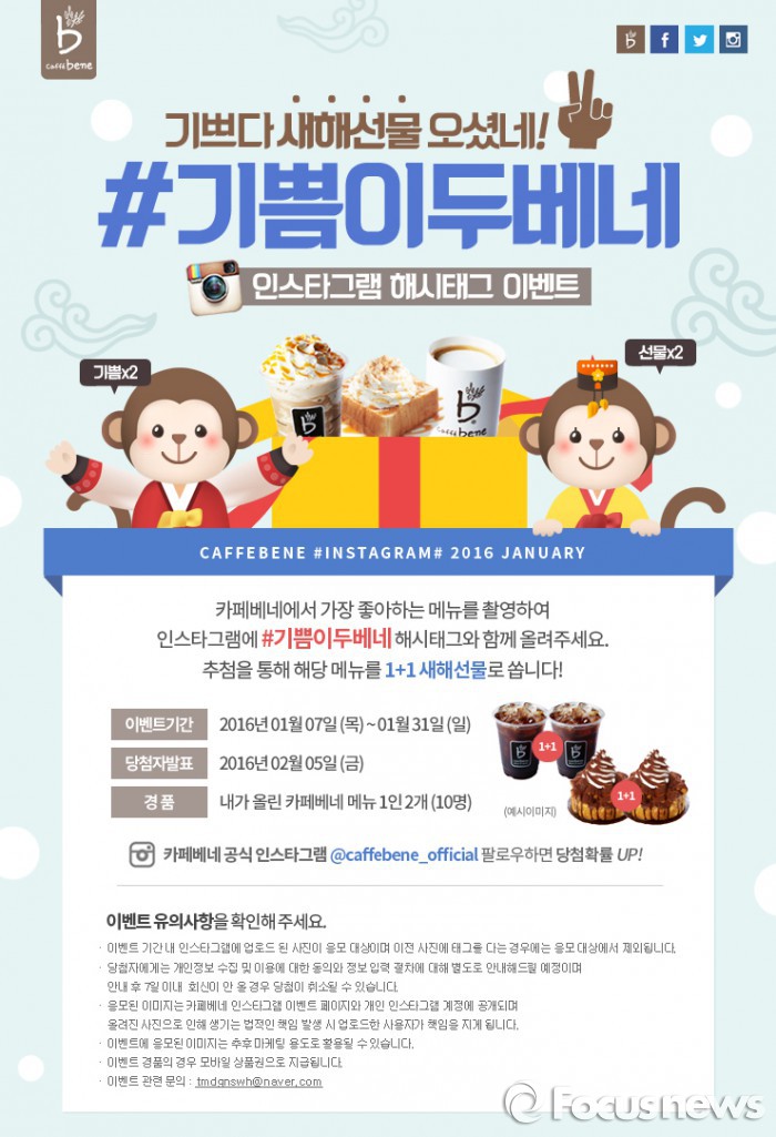 (서울=포커스뉴스) 커피전문점 카페베네는 새해를 맞아 SNS 인스타그램에서 '#기쁨이두베네' 해시태크 이벤트를 이달 한 달 동안 진행한다고 10일 밝혔다.