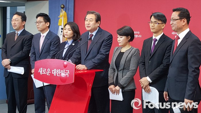 (서울=포커스뉴스) 김무성(가운데) 대표가 10일 오전 서울 여의도 새누리당사에서 1차 인재 영입 대상 6명을 발표하고 있다. 사진 왼쪽부터 박상헌 공간과미디어연구소 소장, 김태현 변호사, 전희경 자유경제원 사무총장, 김 대표, 배승희 변호사, 변환봉 서울지방변호사회 사무총장, 최진녕 변호사.