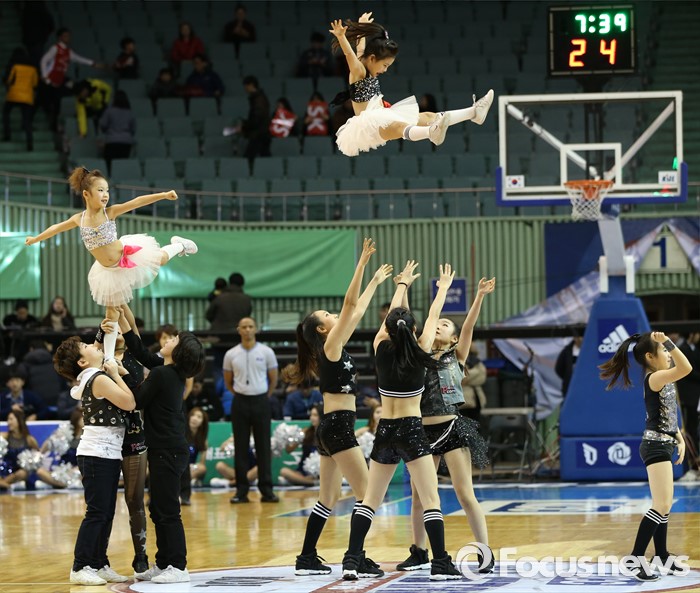 (서울=포커스뉴스) 15일 서울 잠실실내체육관에서 열린 2015-2016 프로농구 올스타전 오프닝 행사로 열린 연예인 농구팀-유소년 올스타 경기에서 어린이 치어리더가 고난도의 스턴트 치어리딩을 선 보이고 있다.