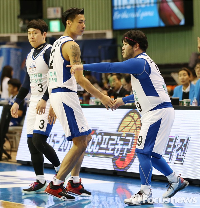(서울=포커스뉴스) 15일 서울 잠실실내체육관에서 열린 2015-2016 프로농구 올스타전 오프닝 행사로 열린 연예인 농구팀-유소년 올스타 경기에서 연예인팀 김기방(오른쪽)이 노민혁과 교체해 경기에 투입되고 있다.