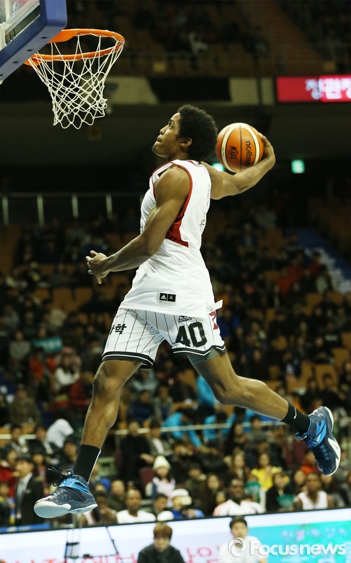 (서울=포커스뉴스) 10일 서울 잠실실내체육관에서 열린 2015-2016 프로농구 올스타전 덩크슛 콘테스트 예선에서 샤크 맥키식이 원핸드 덩크슛을 시도하고 있다.