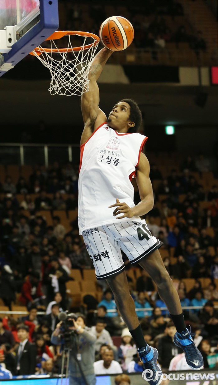 (서울=포커스뉴스) 10일 서울 잠실실내체육관에서 열린 2015-2016 프로농구 올스타전 덩크슛 콘테스트 예선에서 샤크 맥키식이 원햔드 덩크슛을 시도하고 있다.