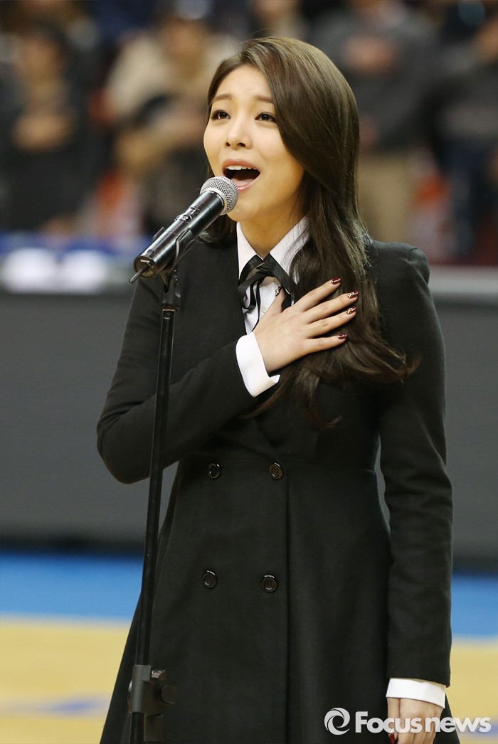 (서울=포커스뉴스) 10일 서울 잠실실내체육관에서 열린 2015-2016 프로농구 올스타전에서 가수 에일리가 애국가를 부르고 있다.