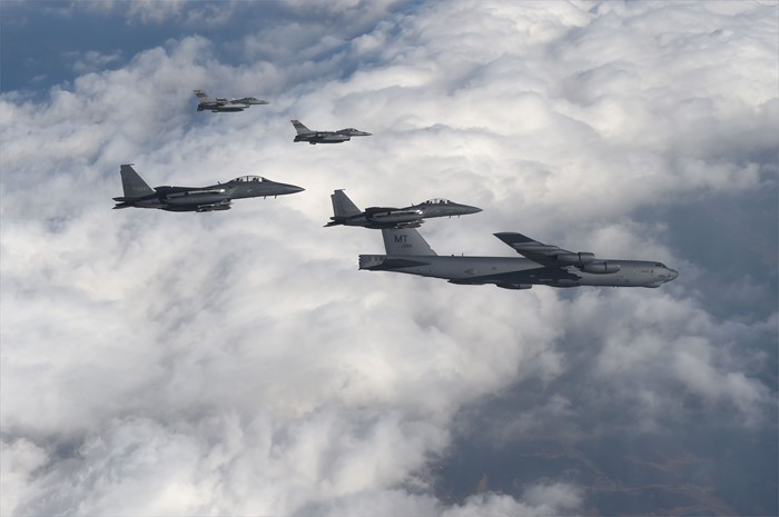 (서울=포커스뉴스) 북한의 수소폭탄 실험 이후 미국의 핵우산 제공 방침에 따라 미 공군의 전략 폭격기가 한반도로 전개한 10일 B-52 폭격기와 우리 공군의 F-15K, 미군 F-16 전투기가 한반도 상공을 날고 있다. <사진제공=공군>