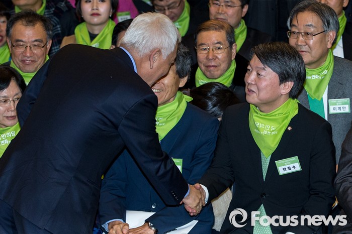(서울=포커스뉴스) 김한길(왼쪽) 국민의당 의원과 안철수 국민의당 의원이 10일 오후 서울 종로구 세종문화회관 세종홀에서 열린 '국민의당 창당발기인대회'에 자리해 악수하고 있다.