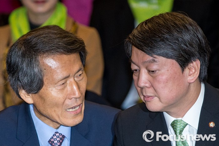 (서울=포커스뉴스) 안철수(오른쪽) 국민의당 의원과 한상진 국민의당 창당준비위원회 공동위원장이 10일 오후 서울 종로구 세종문화회관 세종홀에서 열린 '국민의당 창당발기인대회'에 자리해 대화를 나누고 있다.