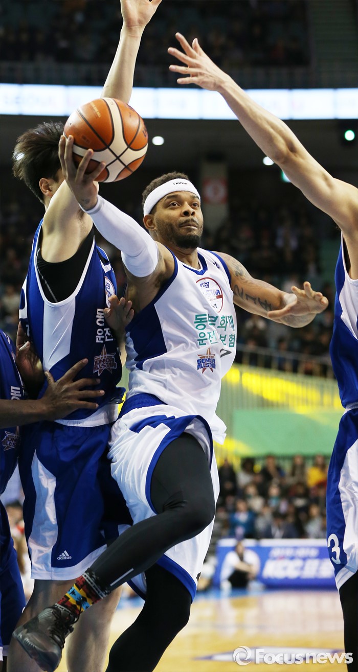 (서울=포커스뉴스) 10일 서울 잠실실내체육관에서 열린 2015-2016 프로농구 올스타전에서 시니어팀 안드레 에밋이 주니어팀 김종규, 임동섭의 수비 사이를 뚫고 패스하고 있다.