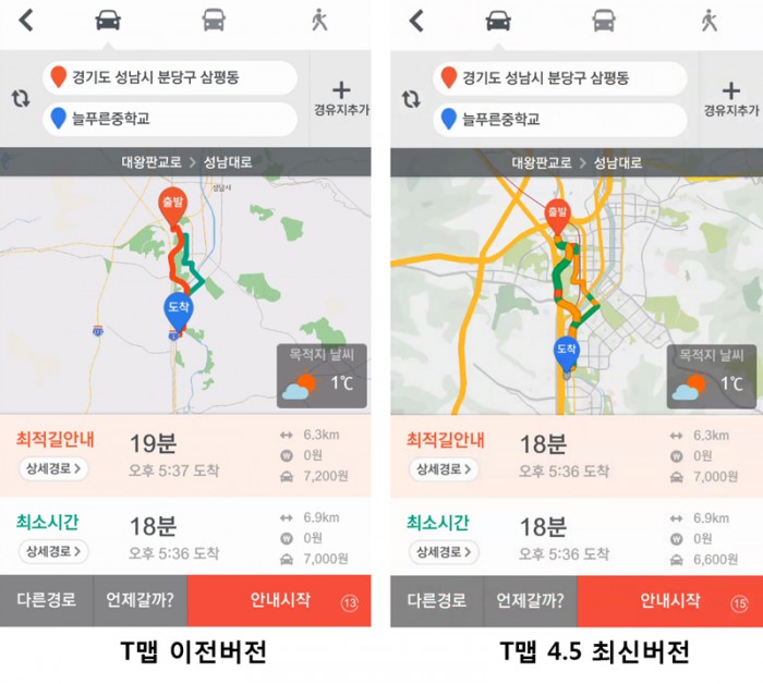 T맵은 11일부터 4.5버전 앱 업데이트를 통해 길안내 시 초당 프레임 재생수를 기존 7fps(frame per second)에서 25fps로 높여 끊김 없는 길안내 화면을 제공한다.