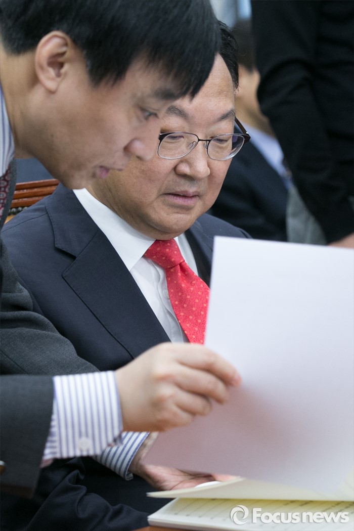 (서울=포커스뉴스) 유일호(오른쪽) 경제부총리 겸 기획재정부 장관 후보자가 11일 오전 서울 여의도 국회 기획재정위원회 전체회의장에서 열린 인사청문회에 출석해 직원과 논의하고 있다.