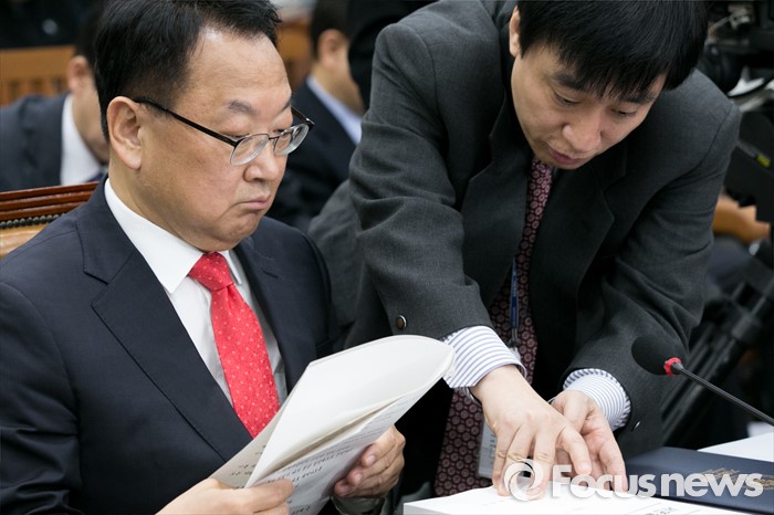 (서울=포커스뉴스) 유일호(왼쪽) 경제부총리 겸 기획재정부 장관 후보자가 11일 오전 서울 여의도 국회 기획재정위원회 전체회의장에서 열린 인사청문회에 출석해 직원과 논의하고 있다.