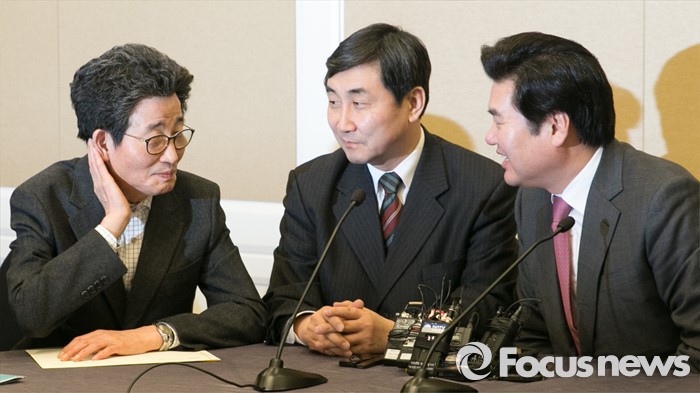 (서울=포커스뉴스) 11일 오전 서울 여의도 국회 귀빈식당에서 20대 총선 선거구 획정 기준 및 쟁점 법안 논의를 위해 진행된 여야 원내지도부 회동에 참석한 원유철(오른쪽부터) 새누리당 원내대표, 이종걸 더불어민주당 원내대표, 이목희 정책위의장이 대화하고 있다.