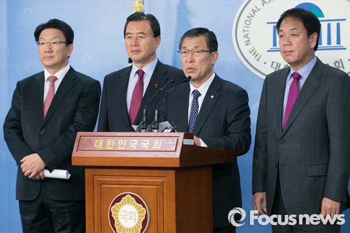 (서울=포커스뉴스) 황진하(오른쪽 두번째) 새누리당 사무총장이 11일 오전 서울 여의도 국회 정론관에서 공천룰과 관련해, 기자회견을 하고 있다.