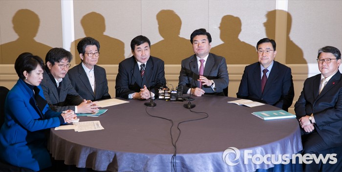 (서울=포커스뉴스) 11일 오전 서울 여의도 국회 귀빈식당에서 20대 총선 선거구 획정 기준 및 쟁점 법안 논의를 위해 진행된 여야 원내지도부 회동에 참석한 의원들이 취재진을 향해 모두발언을 하고 있다. 왼쪽부터 이언주 더불어민주당 원내대변인, 이춘석 원내수석부대표, 이목희 정책위의장, 이종걸 원내대표, 원유철 새누리당 원내대표, 김정훈 정책위의장, 조원진 원내수석부대표.
