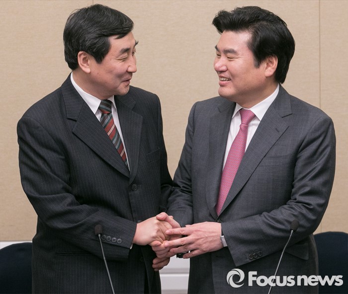 (서울=포커스뉴스) 11일 오전 서울 여의도 국회 귀빈식당에서 20대 총선 선거구 획정 기준 및 쟁점 법안 논의를 위해 진행된 여야 원내지도부 회동에 참석한 원유철(오른쪽) 새누리당 원내대표와 이종걸 더불어민주당 원내대표가 인사하고 있다.