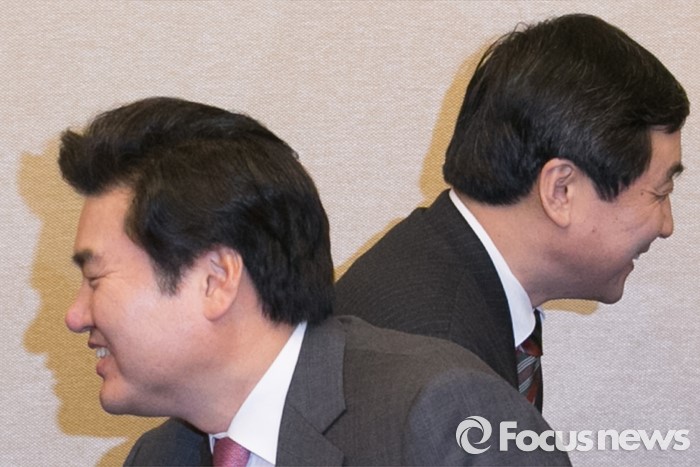 (서울=포커스뉴스) 11일 오전 서울 여의도 국회 귀빈식당에서 20대 총선 선거구 획정 기준 및 쟁점 법안 논의를 위해 진행된 여야 원내지도부 회동에 참석한 원유철(왼쪽) 새누리당 원내대표와 이종걸 더불어민주당 원내대표가 각각 의원들과 인사하고 있다.