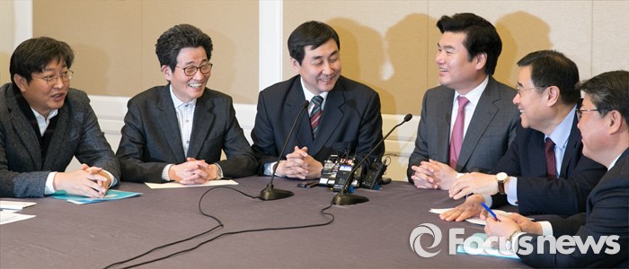 (서울=포커스뉴스) 11일 오전 서울 여의도 국회 귀빈식당에서 20대 총선 선거구 획정 기준 및 쟁점 법안 논의를 위해 진행된 여야 원내지도부 회동에 참석한 의원들이 대화하고 있다. 왼쪽부터 이춘석 더불어민주당 원내수석부대표, 이목희 정책위의장, 이종걸 원내대표, 원유철 새누리당 원내대표, 김정훈 정책위의장, 조원진 원내수석부대표.