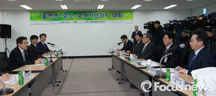 (대전=포커스뉴스) 황교안 국무총리가 11일 대전 유성구 융합기술연구생산센터를 방문, 출연연-중소·중견기업과 간담회를 갖고 있다.