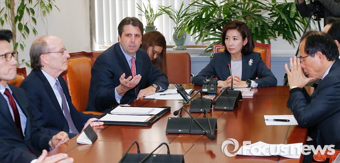 (서울=포커스뉴스) 11일 오후 서울 여의도 국회 외교통일위원회에서 나경원(오른쪽 두번째) 위원장과 여야 의원, 마크 리퍼트(왼쪽 세번째) 주한미국대사가 북한 핵실험 관련 간담회를 하고 있다.