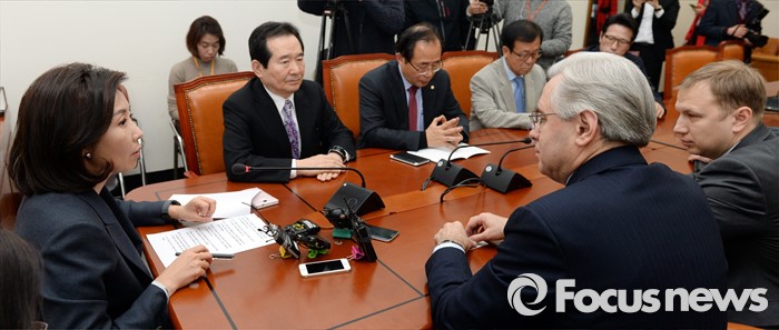 (서울=포커스뉴스) 11일 오후 서울 여의도 국회 외교통일위원회에서 나경원 위원장과 여야 의원, 알렉산드르 안드레예비치 티모닌 주한러시아대사가 북한 핵실험 관련 간담회를 하고 있다.고 있다.