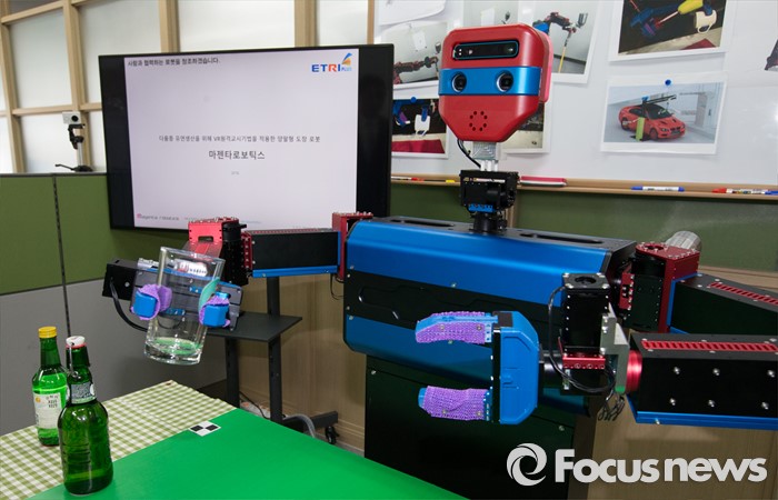 (대전=포커스뉴스) 황교안 국무총리가 11일 대전 유성구 융합기술연구생산센터 내 마젠타로보틱스를 방문, 도장로봇이 소맥 폭탄주제조 시연을 하고 있다.