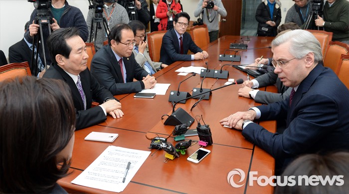 (서울=포커스뉴스) 11일 오후 서울 여의도 국회 외교통일위원회에서 나경원 위원장과 여야 의원, 알렉산드르 안드레예비치 티모닌 주한러시아대사가 북한 핵실험 관련 간담회를 하고 있다.