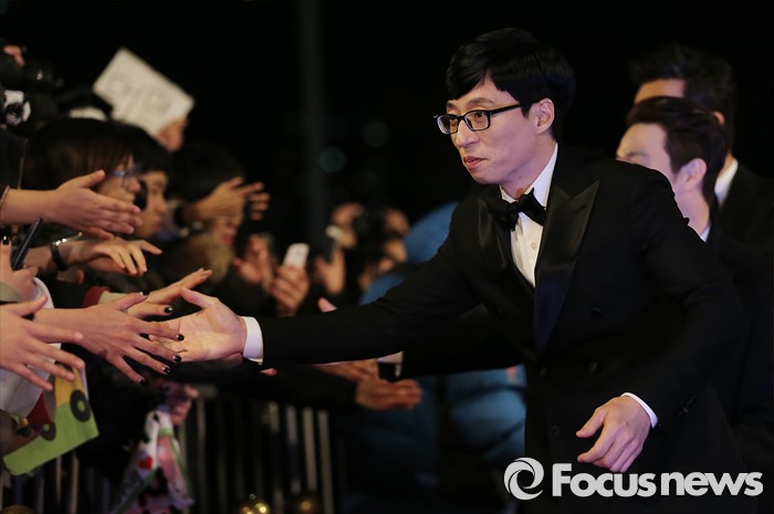 인터넷 언어폭력은 엔터테인먼트 업계는 물론이고 사회 전체적으로 반드시 척결해야 할 사안 중 하나입니다. 당사는 건전한 인터넷 문화 확립을 위해 꾸준히 노력할 것입니다. 이에 대한 많은 관심과 배려를 부탁드립니다. 감사합니다.(서울=포커스뉴스) 29일 오후 서울 마포구 MBC 미디어센터에서 열린 '2015 MBC 방송연예대상' 시상식에 참석한 개그맨 유재석이 팬들과 악수를 하고 있다. 2015.12.29 김유근 기자