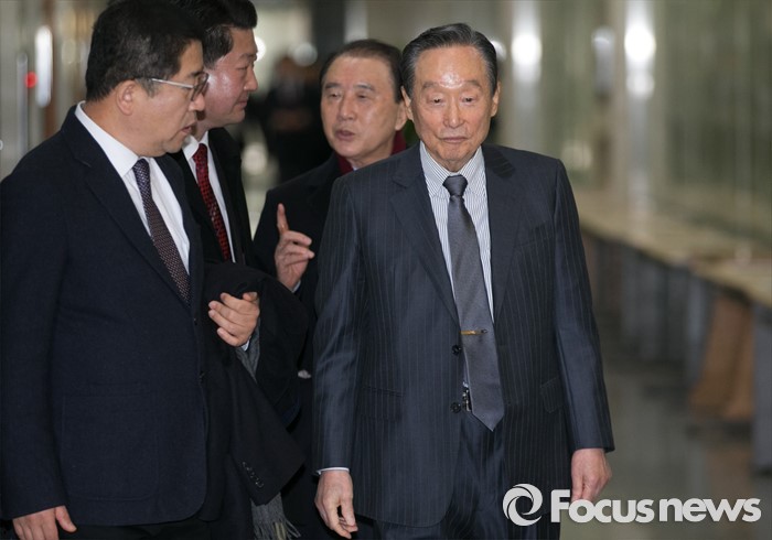 (서울=포커스뉴스) 권노갑(오른쪽) 더불어민주당 상임고문이 12일 오전 서울 여의도 국회 정론관에서 탈당 기자회견을 위해 이동하고 있다.