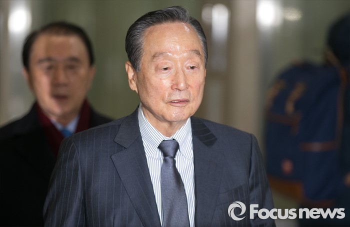 (서울=포커스뉴스) 권노갑(오른쪽) 더불어민주당 상임고문이 12일 오전 서울 여의도 국회 정론관에서 탈당 기자회견을 위해 이동하고 있다.