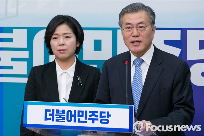 (서울=포커스뉴스) 문재인(오른쪽) 더불어민주당 대표가 12일 오전 서울 여의도 국회 당대표실에서 양향자(왼쪽) 전 삼성전자 상무의 입당 기자회견에 참석해 인사말을 하고 있다. 양 전 상무는 삼성전자 최초의 고졸여성 임원으로 삼성전자 메모리사업부 플래시 개발실 상무를 역임했다.