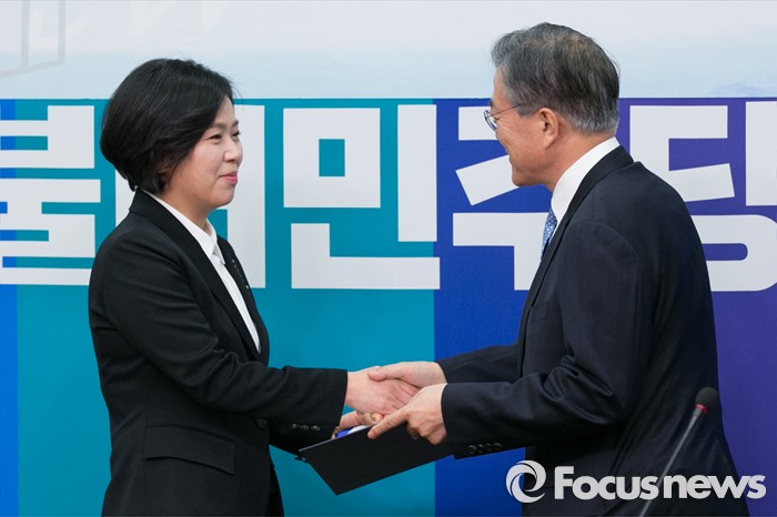 (서울=포커스뉴스) 양향자(왼쪽) 전 삼성전자 상무가 12일 오전 서울 여의도 국회 더불어민주당 당대표실에서 입당 기자회견을 마치고 문재인 대표와 악수하고 있다. 양 전 상무는 삼성전자 최초의 고졸여성 임원으로 삼성전자 메모리사업부 플래시 개발실 상무를 역임했다.