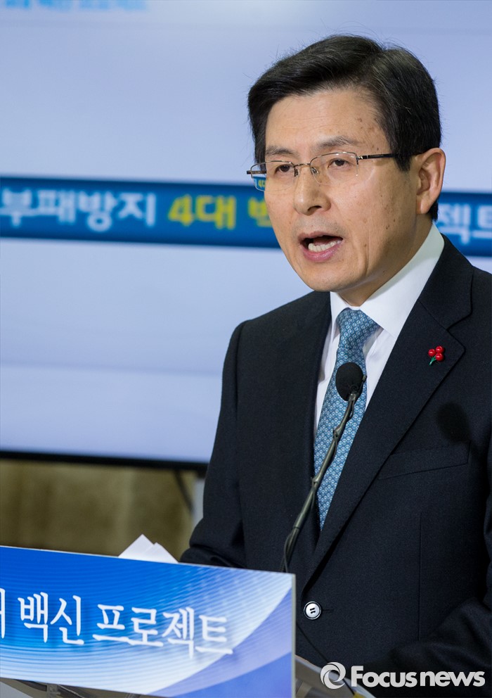 (서울=포커스뉴스) 12일 오전 서울 종로구 정부서울청사에서 황교안 국무총리가 부패방지 4대 백신 프로젝트를 발표하고 있다. 정부는 이날 발표를 통해 실시간 감시, 리스크 관리, 정보상시 공유ㆍ연계, 내부클린시스템의 4대 백신 프로젝트를 2016년 부터 16개 분야, 240조원 운용 규모의 공공시스템에 본격 가동한다고 밝혔다.