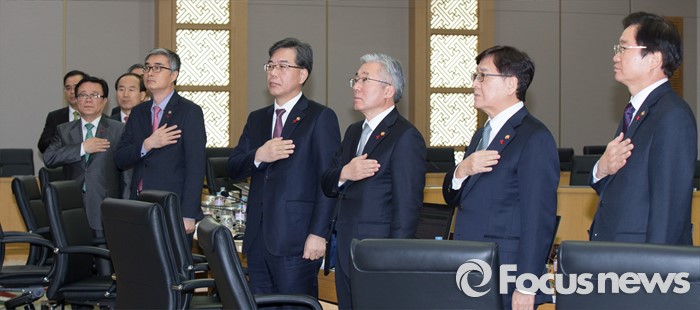 (세종=포커스뉴스) 12일 오전 세종시 정부세종청사 국무회의장에서 열린 서울-세종 영상 국무회의에 참석한 국무위원들이 국기에대한 경례를 하고 있다.