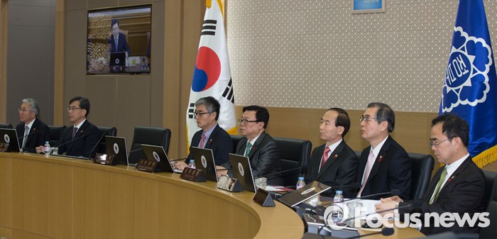 (세종=포커스뉴스) 12일 오전 세종시 정부세종청사 국무회의장에서 열린 서울-세종 영상 국무회의에 참석한 국무위원들이 황교안 총리의 발언을 경청하고 있다.