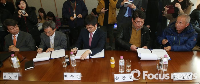 (서울=포커스뉴스) 12일 오전 서울 서대문구 법무법인 지평 회의실에서 열린 '삼성전자 반도체 등 사업장에서의 백혈병 등 질환 발병과 관련한 문제 해결을 위한 조정위원회'에서 조정 주체 교섭단 대표자들이 최종 합의서에 서명하고 있다.