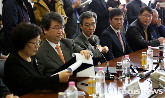 (서울=포커스뉴스) 12일 오전 서울 서대문구 충정로 법무법인 지평 회의실에서 열린 '삼성전자 반도체 등 사업장에서의 백혈병 등 질환 발병과 관련한 문제 해결을 위한 조정위원회'에 김지형(왼쪽 두번째) 조정위원장이 참석하고 있다.