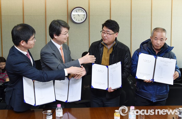 (서울=포커스뉴스) 12일 오전 서울 서대문구 충정로 법무법인 지평 회의실에서 열린 '삼성전자 반도체 등 사업장에서의 백혈병 등 질환 발병과 관련한 문제 해결을 위한 조정위원회'에서 조정 주체 교섭단 대표자들이 최종 합의서에 서명한 뒤 악수를 하고 있다.