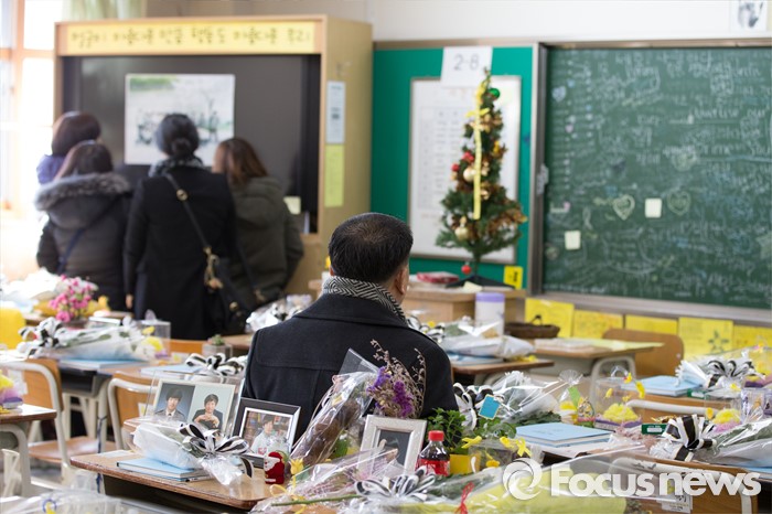 (안산=포커스뉴스) 단원고 생존 학생들의 졸업식이 열린 12일 오후 경기도 안산시 단원고등학교에서 시민들이 교실을 둘러보고 있다.