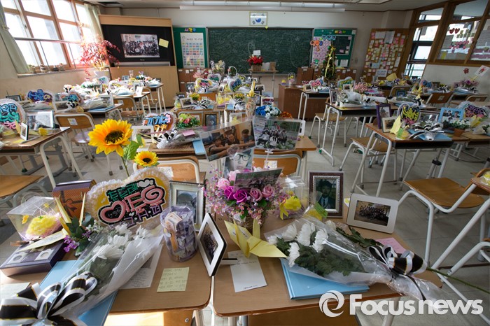 (안산=포커스뉴스) 단원고 생존 학생들의 졸업식이 열린 12일 오후 경기도 안산시 단원고등학교에 희생자 아이들의 책상이 꾸며져 있다.