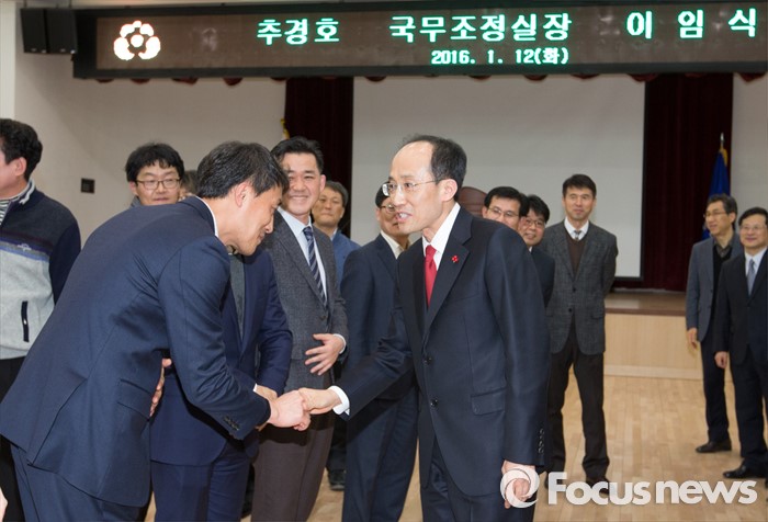 (세종=포커스뉴스) 추경호 국무조정실장이 12일 오후 세종시 정부세종청사 1동 대강당에서 열린 이임식에서 직원들과 인사를 하고 있다.