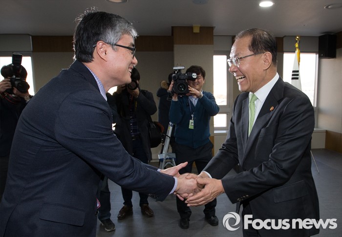(세종=포커스뉴스) 황우여 사회부총리 겸 교육부장관이 12일 오후 세종시 정부세종청사 교육부 대회의실에서 열린 이임식에서 이영 차관과 악수를 하고 있다.