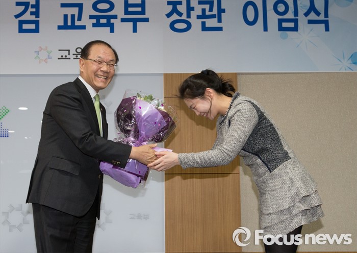 (세종=포커스뉴스) 황우여 사회부총리 겸 교육부장관이 12일 오후 세종시 정부세종청사 교육부 대회의실에서 열린 이임식에서 꽃다발을 받고 있다.