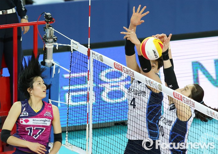 (인천=포커스뉴스) 12일 인천 계양체육관에서 열린 '2015-2016NH농협 V-리그' 여자부 흥국생명-IBK기업은행 경기에서 IBK기업은행 김희진(4), 박정아가 흥국생명 이재영의 연타를 블로킹으로 막고 있다.