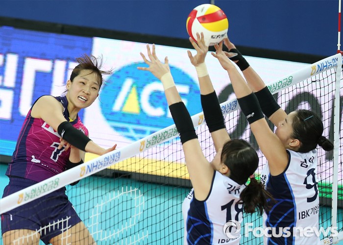 (인천=포커스뉴스) 12일 인천 계양체육관에서 열린 '2015-2016NH농협 V-리그' 여자부 흥국생명-IBK기업은행 경기에서 흥국생명 정시영이 IBK기업은행 김사니, 김유리(18)의 블로킹 위로 강스파이크를 날리고 있다.